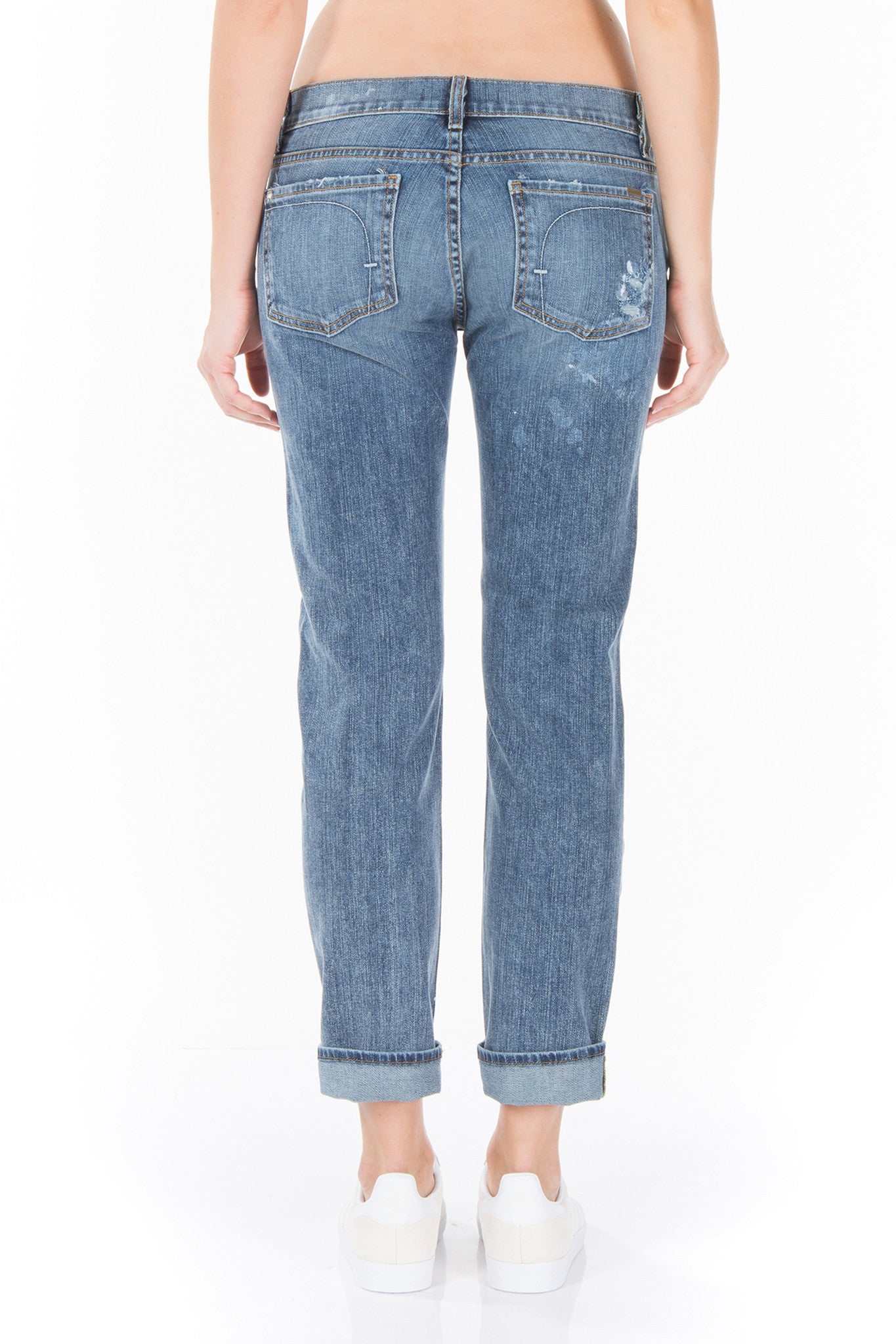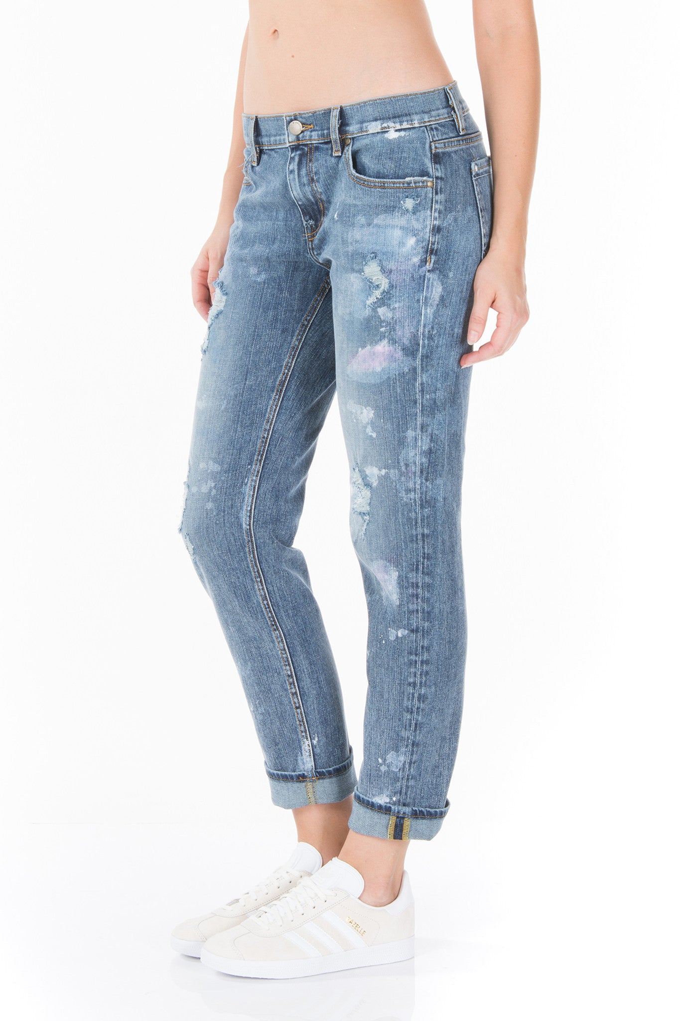 GET IN TOUCH WITH YOUR INNER PICASSO IN THIS PAINTED PAIR OF BLUES. AXL IS THE "GIRLFRIEND" JEAN. LOW RISE, RELAXED, BUT A LITTLE MORE FITTED THROUGHOUT THE LEG THAN YOUR TYPICAL BOYFRIEND CUT. CROPPED LENGTH. ZIPPER FLY.
